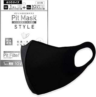ピットマスク スタイル3D 不織布 フィルター 使用 日本製 洗えるマスク 伸縮性 繰り返し洗える 高機能マスク UVカット 紫外線対策 試験証明書取得済み 吸水速乾 フィルター 10枚付き 3色2サイズ(ブラック, ノーマルサイズ)