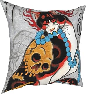 クッションカバー どくろタトゥーンネコ ソファ背当て 北欧 和室 ベッド シンプル 座布団カバー 装飾枕カバー 正方形 抱き枕カバー 手触り良く 滑らか おしゃれ 部屋飾り 雑貨 生活 家庭用 オフィス 椅子 車内 装飾 プレゼント 45×45cm