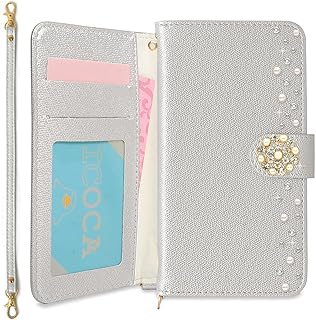 OPPO A54 5G ケース OPG02 手帳型 かわいい ストーン パール キラキラ フラワー ストラップ付き カバー (シルバー) SIMフリー